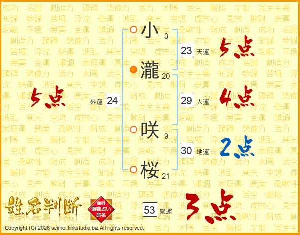 小(3画)瀧(20画) 咲(9画)桜(21画)