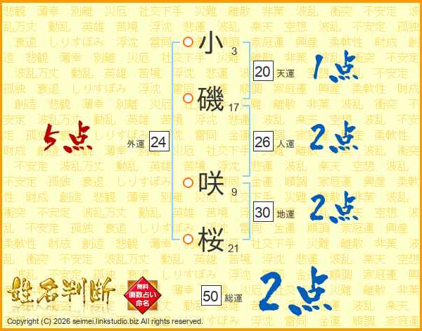 小(3画)磯(17画) 咲(9画)桜(21画)