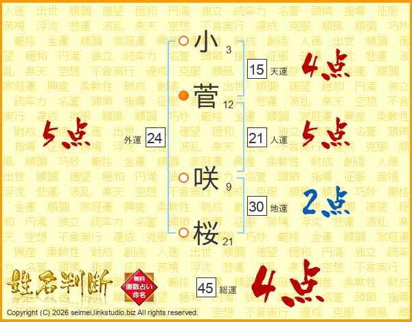 小(3画)菅(12画) 咲(9画)桜(21画)