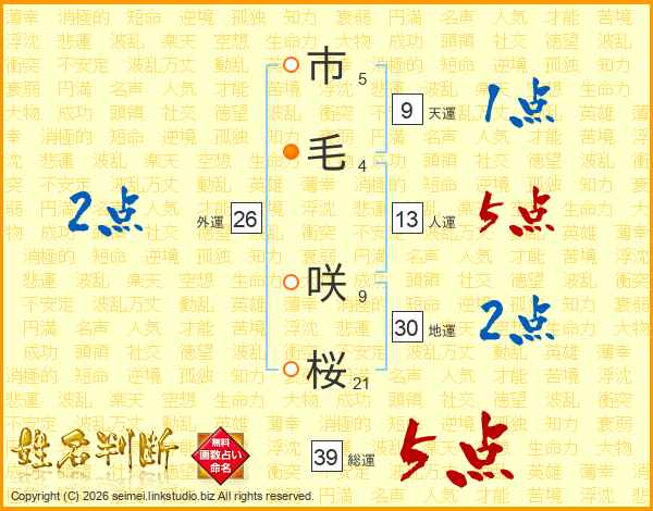 市毛咲桜さんの総運は39画の5点!