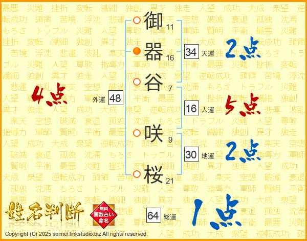 御(11画)器(16画)谷(7画) 咲(9画)桜(21画)