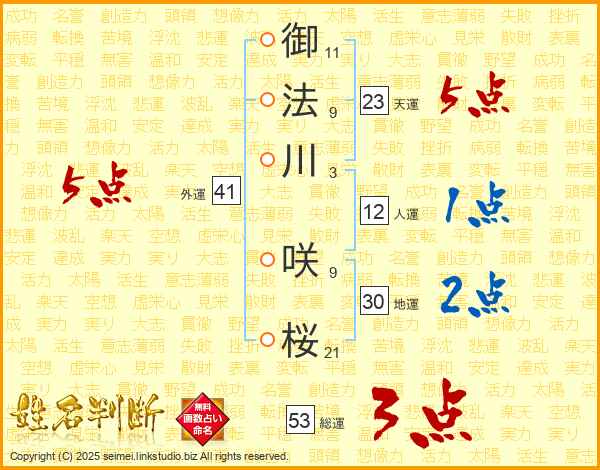 御(11画)法(9画)川(3画) 咲(9画)桜(21画)