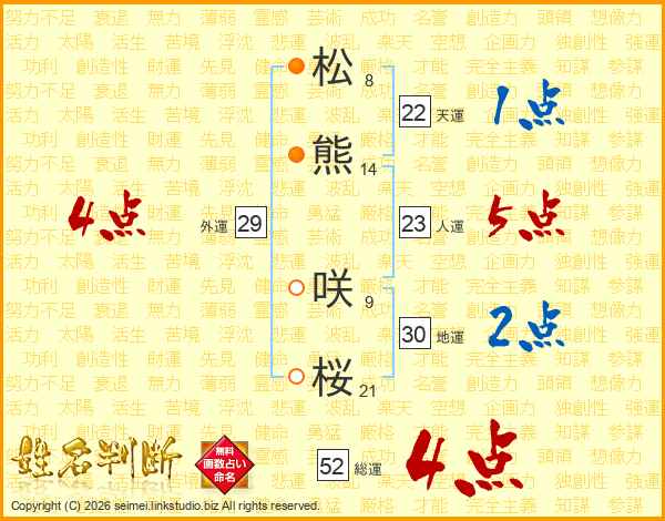 松(8画)熊(14画) 咲(9画)桜(21画)