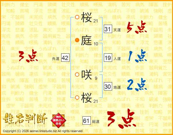 桜(21画)庭(10画) 咲(9画)桜(21画)