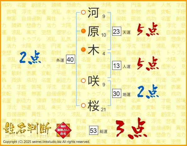 河原木咲桜さんの総運は53画の3点!