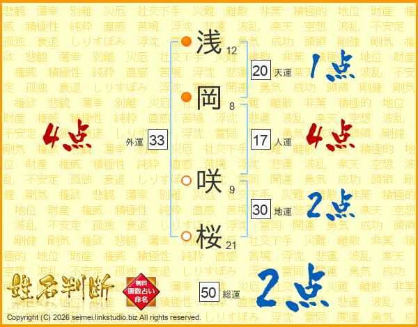 浅岡咲桜さんの外運は33画の4点!