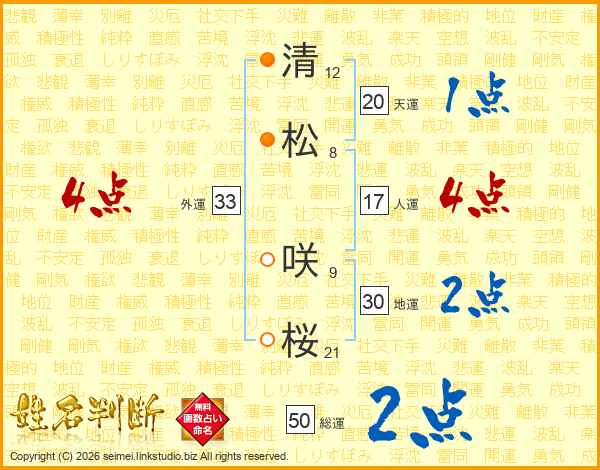 生活面を象徴する運勢です。外部から受ける影響力を表し、結婚運、家庭運や職場、環境への順応性を表します。総運から人運を引いた画数。姓や名が1文字の場合を除く。