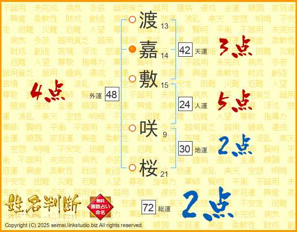 渡嘉敷咲桜さんの総運は72画の2点!