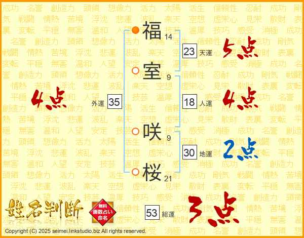 福(14画)室(9画) 咲(9画)桜(21画)