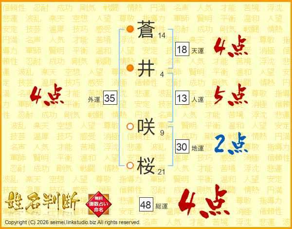 蒼(14画)井(4画) 咲(9画)桜(21画)