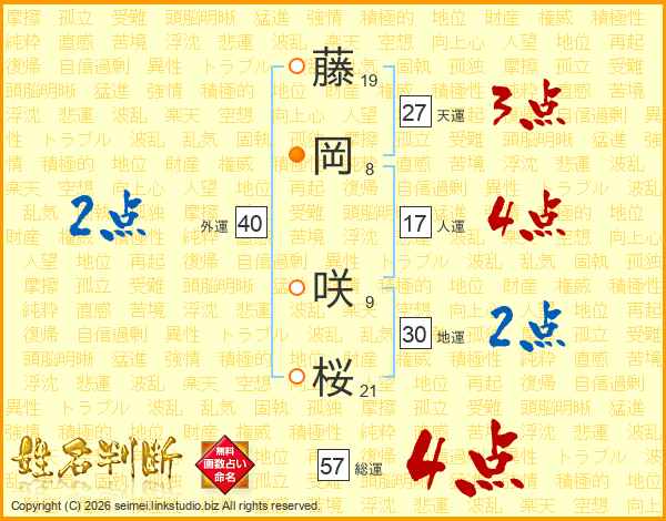 藤(19画)岡(8画) 咲(9画)桜(21画)
