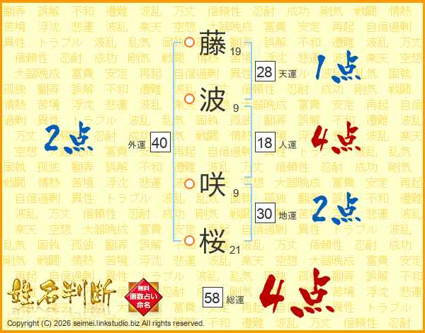 藤波咲桜さんの総運は58画の4点!
