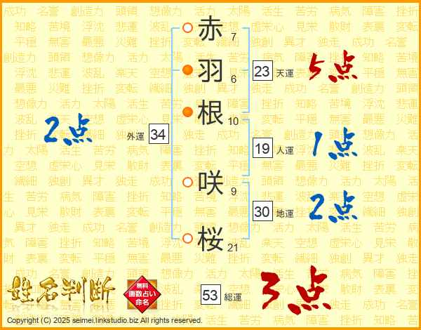 赤(7画)羽(6画)根(10画) 咲(9画)桜(21画)