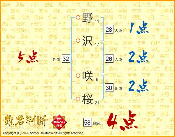 野沢咲桜さんの総運は58画の4点!