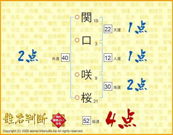 生活面を象徴する運勢です。外部から受ける影響力を表し、結婚運、家庭運や職場、環境への順応性を表します。総運から人運を引いた画数。姓や名が1文字の場合を除く。