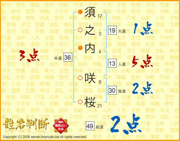 須(12画)之(3画)内(4画) 咲(9画)桜(21画)