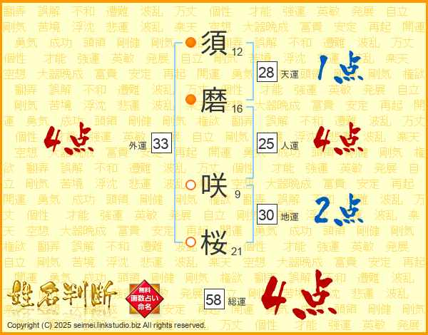 須(12画)磨(16画) 咲(9画)桜(21画)