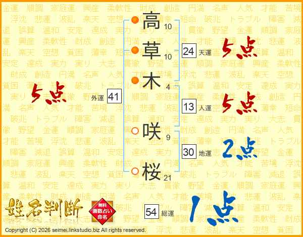 高(10画)草(10画)木(4画) 咲(9画)桜(21画)