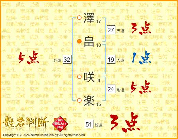 澤(17画)畠(10画) 咲(9画)楽(15画)