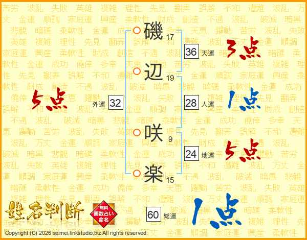 磯辺咲楽さんの外運は32画の5点!