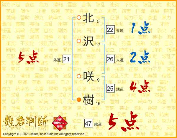 北(5画)沢(17画) 咲(9画)樹(16画)