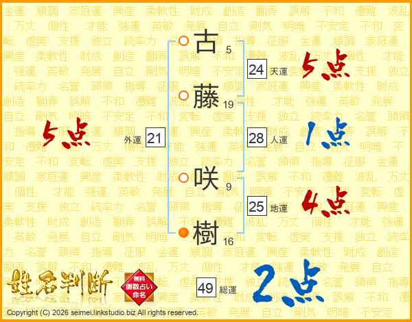 古藤咲樹さんの総運は49画の2点!