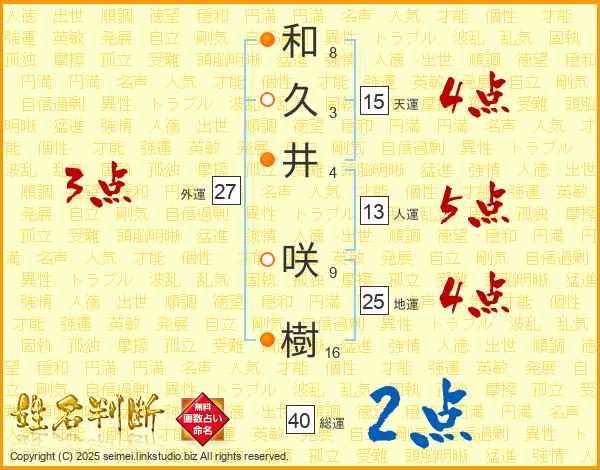 和(8画)久(3画)井(4画) 咲(9画)樹(16画)