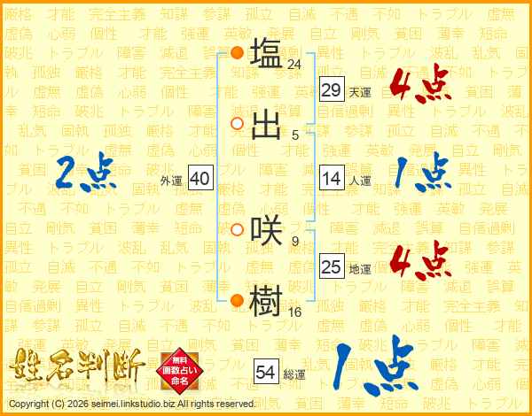 塩(24画)出(5画) 咲(9画)樹(16画)