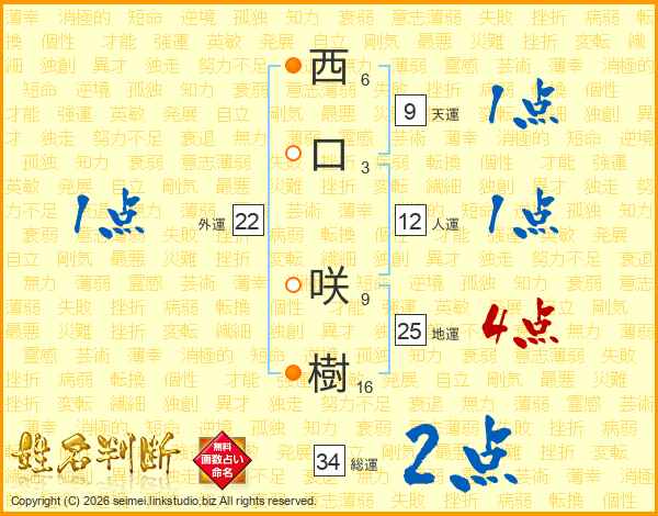西(6画)口(3画) 咲(9画)樹(16画)
