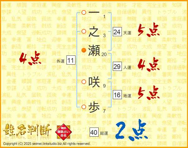 一(1画)之(3画)瀬(20画) 咲(9画)歩(7画)