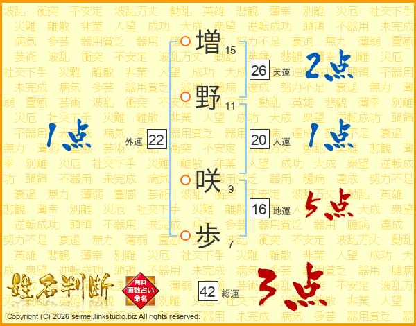 増(15画)野(11画) 咲(9画)歩(7画)
