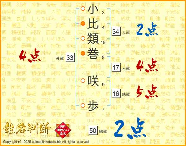 小(3画)比(4画)類(19画)巻(8画) 咲(9画)歩(7画)