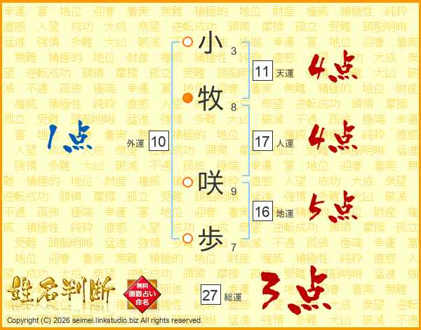 小(3画)牧(8画) 咲(9画)歩(7画)