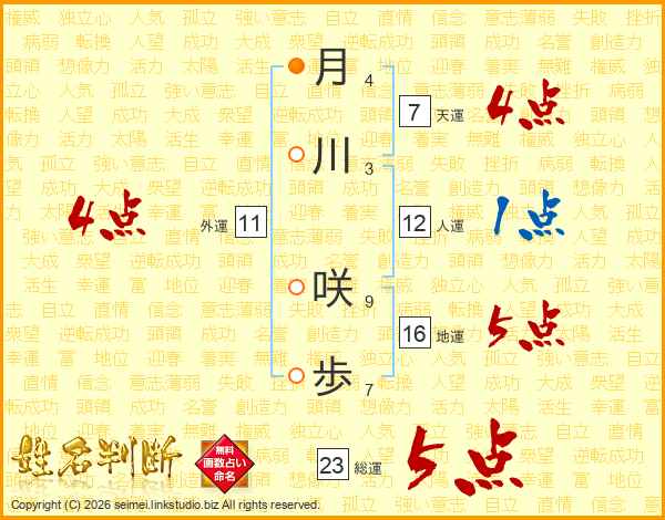 月(4画)川(3画) 咲(9画)歩(7画)