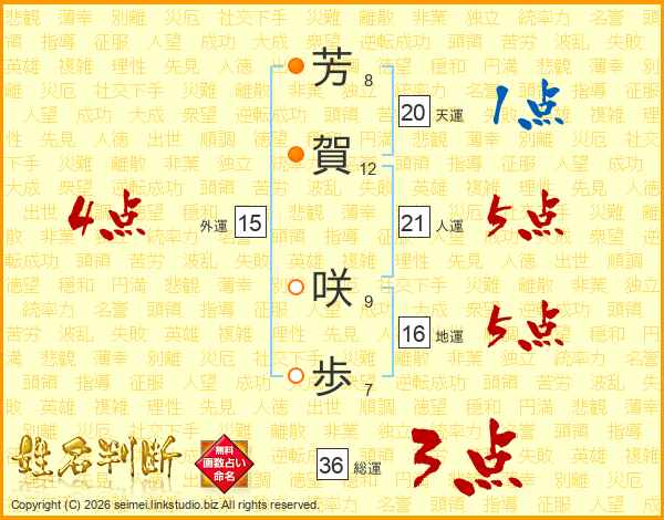 芳(8画)賀(12画) 咲(9画)歩(7画)