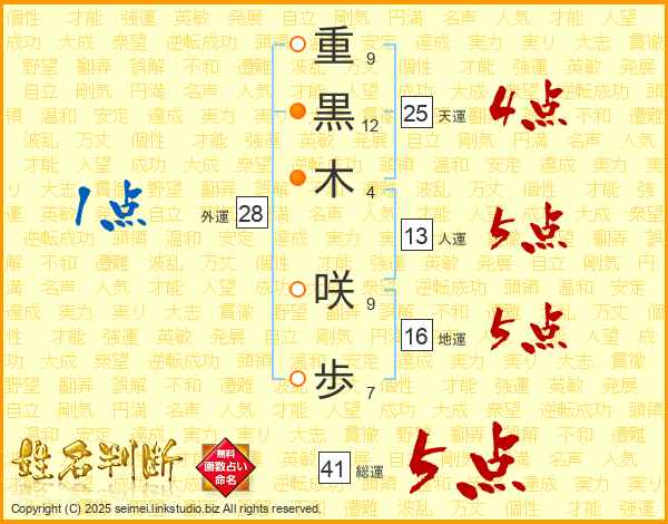 重(9画)黒(12画)木(4画) 咲(9画)歩(7画)