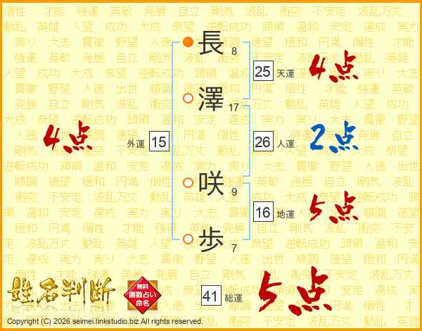 長(8画)澤(17画) 咲(9画)歩(7画)