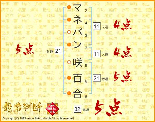 生活面を象徴する運勢です。外部から受ける影響力を表し、結婚運、家庭運や職場、環境への順応性を表します。総運から人運を引いた画数。姓や名が1文字の場合を除く。