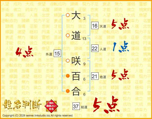 大(3画)道(13画) 咲(9画)百(6画)合(6画)
