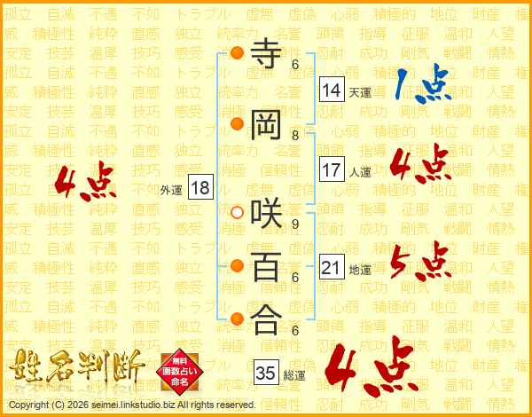 寺(6画)岡(8画) 咲(9画)百(6画)合(6画)