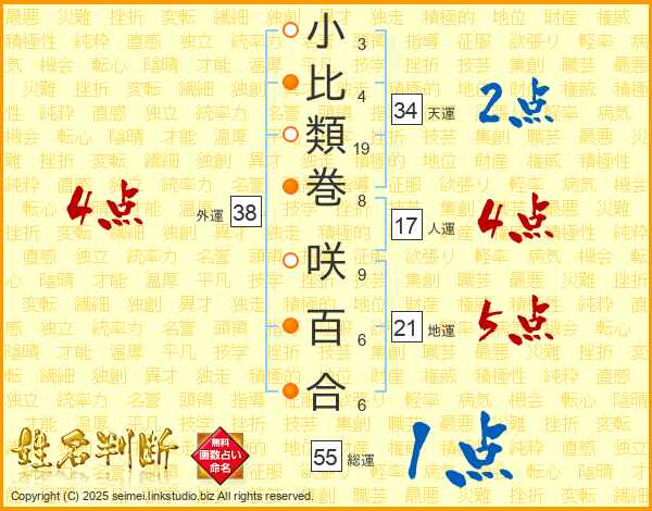 小(3画)比(4画)類(19画)巻(8画) 咲(9画)百(6画)合(6画)