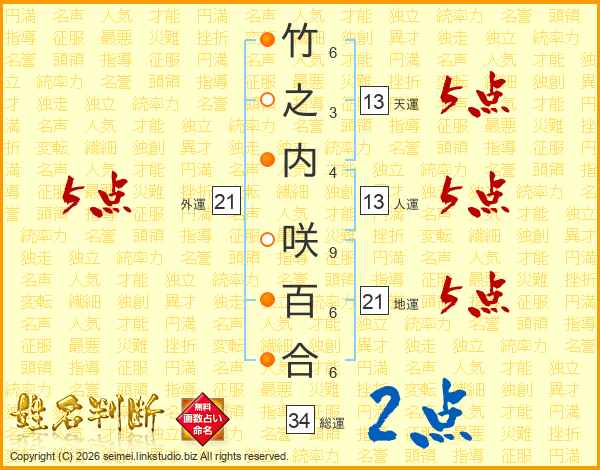 竹之内咲百合さんの人運は13画の5点!