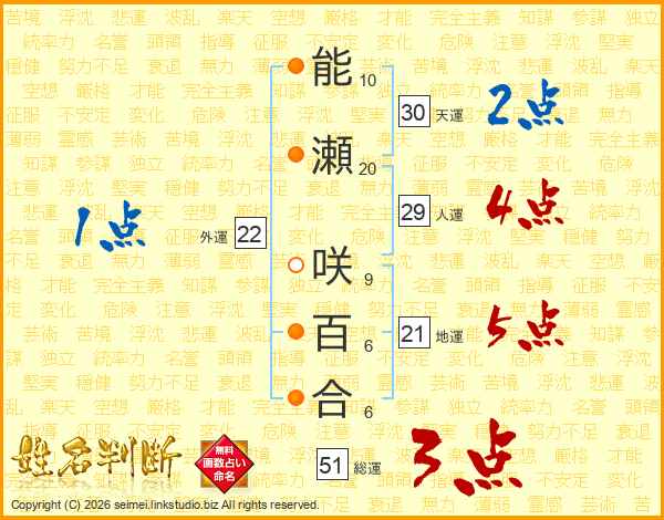 能(10画)瀬(20画) 咲(9画)百(6画)合(6画)