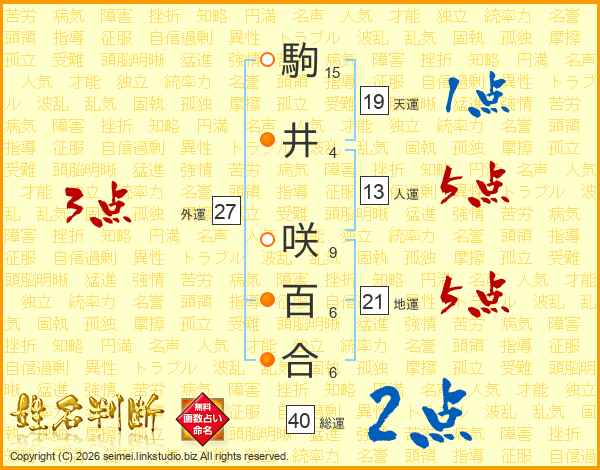 駒井咲百合さんの総運は40画の2点!