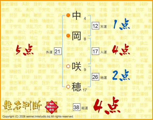 中岡咲穂さんの総運は38画の4点!