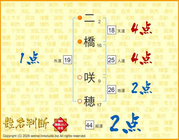二橋咲穂さんの総運は44画の2点!
