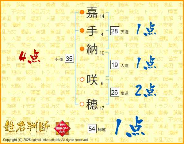 嘉(14画)手(4画)納(10画) 咲(9画)穂(17画)