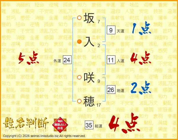 坂(7画)入(2画) 咲(9画)穂(17画)