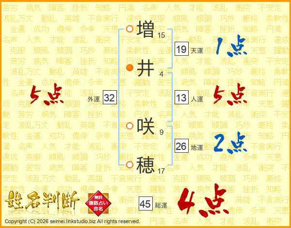 生活面を象徴する運勢です。外部から受ける影響力を表し、結婚運、家庭運や職場、環境への順応性を表します。総運から人運を引いた画数。姓や名が1文字の場合を除く。