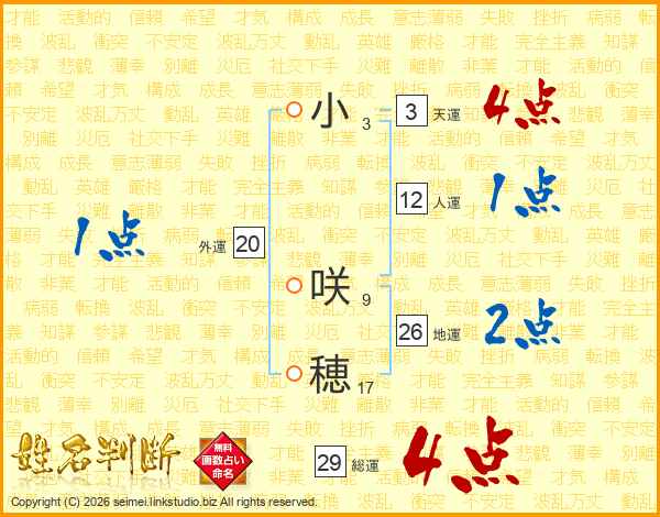 生活面を象徴する運勢です。外部から受ける影響力を表し、結婚運、家庭運や職場、環境への順応性を表します。総運から人運を引いた画数。姓や名が1文字の場合を除く。